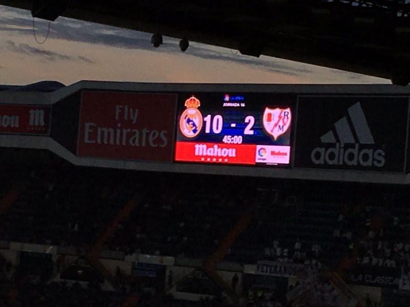 Es previsible que al Real Madrid le toque disculparse muchísimo por un resultado que quien escribe, con unas cuantas décadas de madridismo a sus espaldas, no había atestiguado jamás. El club de Chamartín bate la barrera goleadora de los dos dígitos contra un equipo de Primera División, pero es inviable que nadie en absoluto le felicite por ello. El Madrid va a tener que pedir perdón encarecidamente por haberse ensañado con un enemigo en franca inferioridad numérica desde una fase muy inicial del partido, como habría tenido que disculparse por no haberse ensañado. Si de entrada el Madrid tenía ya muy poco que ganar ante la opinión pública -o publicada- en este encuentro (golear al Rayo era casi obligado y nadie habría ponderado en exceso un buen resultado ni un juego convincente), menos aún habrá ganado tras estos diez goles. Lo dicho: deberá presentar sus más humildes disculpas por absolutamente todo, por este resultado tan exagerado y por el modo en que el marcador electrónico, como prueba la siguiente fotografía, a duras penas reflejaba lo acontecido. "Es incomprensible", se dirá, "que un club con el presupuesto que tiene el Madrid no cuente con los recursos para que un marcador de dos dígitos no adopte automáticamente otro cuerpo de letra para evitar que el número uno quede tan cerca del escudo. Qué vergüenza".