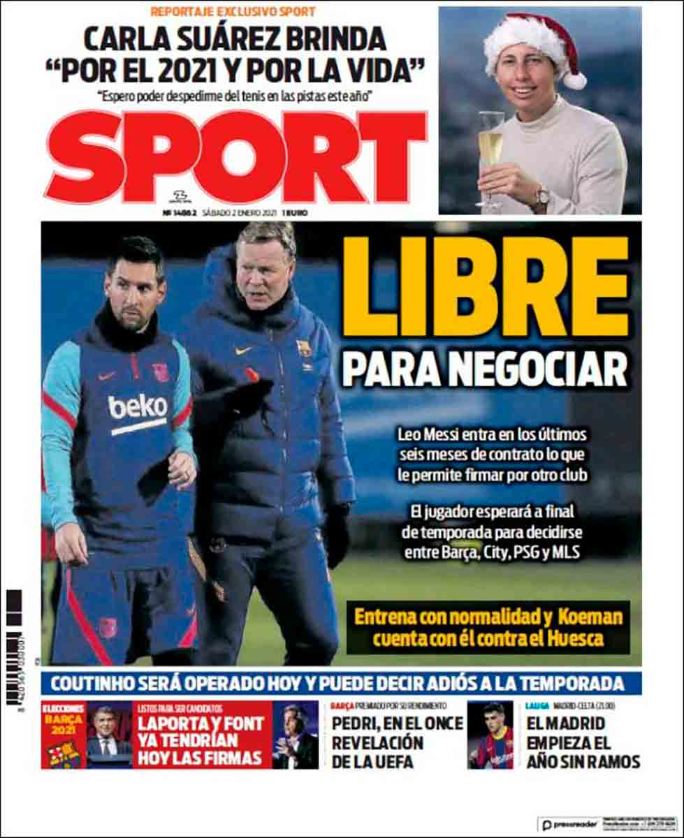 A propósito de cataculés, con las primicias habituales en conserva, en Sport están como la vecina de Mary (de Algo pasa con Mary) cuando se toma por accidente la pastillita destinada a su perro. En Sport andan levantando los sofás con una mano, mientras con la otra pasan el aspirador. Y no dan abasto. LIBRE PARA NEGOCIAR es el lamento sostenido, casi un grito desesperado con sirenas de alarma, con píldora tranquilizante para el lector: “Entrena con normalidad y Koeman cuenta con él contra el Huesca”. Ah, vale. Es como si mantuviera las constantes vitales, mientras la afición se debate en la sala de espera. ¡Pero es que luego están las elecciones! Laporta y Font, Font y Laporta. Agendas y marcianos y marcianadas. Y Pedri para regular el Ph, como tras las resacas, ¡menuda resaca tienen en Can Barsa! Pedrinho es como el tomate o como la naranja. Una cervecita. Y Ramos y su ausencia en el once del Madrid como una bolsa de hielo en la cabeza. En fin. Que nosotros brindamos con Carla, por supuesto.
