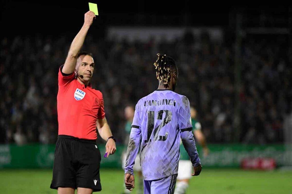 Fue en la segunda parte cuando desenfundó con constancia. Tarde, como siempre. Solo Manchón había visto tarjeta en los locales en el 27' y en el segundo acto se unieron sus compañeros Iván Fernández por una entrada a Ceballos en el 65', Telles tras llegar tarde en un balón dividido con Camavinga en el 73', Bermu por agarrar a Valverde en el 77' y Pedro por un balonazo a Camavinga en el 88'. El medio francés también la vio, por cierto, al devolverle el pelotazo. Luis Aguado se fue de rositas de nuevo por un sujetar a Camavinga cuando se escapaba en el 64'.