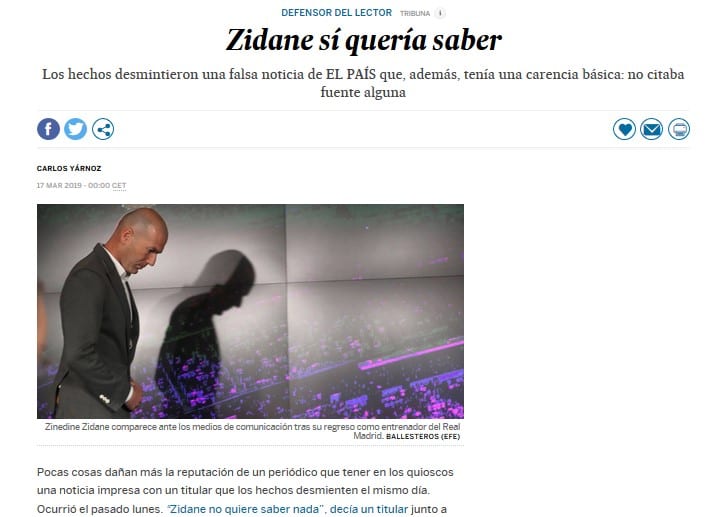 Dada la gravedad de esta infracción y la altura de la información falsa -falsa en palabras del propio defensor del lector-, conviene preguntarse por qué Diego Torres no es citado en el texto que afea su profundo error. «He entendido que no aporta nada a mis objetivos citar y mencionar explícitamente a los autores de los textos que comento», razona Carlos Yárnoz preguntado al respecto por esta parte. «Si algún lector tiene interés en saberlo por el motivo que sea, mis textos en la web van acompañados de los enlaces en los que se pueden leer las informaciones que comento, y por tanto también los nombres de los firmantes. Y en papel, pueden averiguarlo con facilidad a través de cualquier buscador. He recibido muchísimos mensajes a raíz del tema de Zidane y solo otro lector y usted me han planteado la ausencia del nombre del firmante». Desde luego, Diego Torres es de sobra conocido. No en vano ya fue apartado del seguimiento a la información del Real Madrid por su especial falta de escrúpulos y rigor. Viene de muy atrás, especialmente de la época en que tomó al entrenador del club hasta 2013, José Mourinho, por el centro de todas las iras de los escépticos -y sus fuentes-. Diego Torres entró en aquella época en la vorágine de poner en boca de sus informadores casos que quizá no habían pasado exactamente como los narraba. Es una forma de licencia periodística. Así, situó a un futbolista, Esteban Granero, donde no estaba. El propio jugador se lo recriminó en público. Después, fue el mismo Florentino Pérez quien en una rueda de prensa le situó («A usted le gusta mucho la novela»), sin que EL PAÍS, que seguro disfrutaba de estos réditos polemistas en los indicadores de permeabilidad digital, decidiera nada. Carlos Yárnoz, recién llegado a su función, se defiende: «Llevo sólo dos meses en esta función y mis comentarios se refieren a lo que ocurre en estos momentos, no tanto a la trayectoria que hayan podido seguir el periódico o sus periodistas».