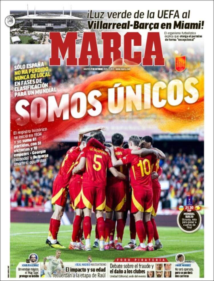 Marca elige la misma zona de su portada para anunciar la noticia entre admiraciones. Entendemos que, antes de aprobar la primera plana, alguien con actitud parecida al meme de «¡que me quedo sin comer!» le habrá mandado al presidente de la liga un WhatsApp con una captura preguntándole algo similar a: ¿está bien así la portada, Javi, o quieres que lo pongamos de otra forma?