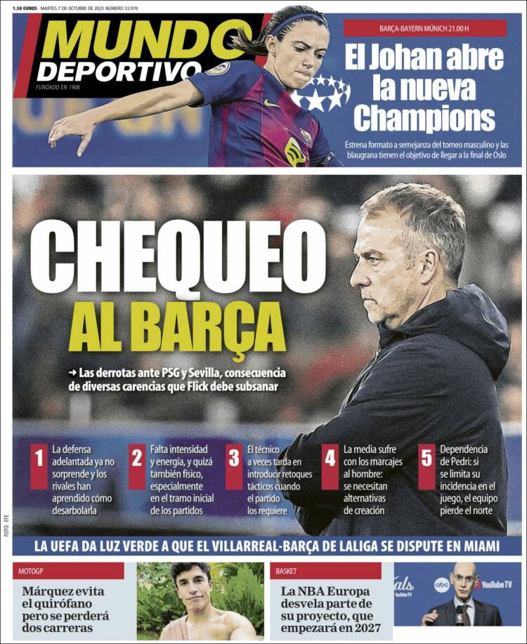 Mundo Deportivo enumera diversas carencias que debe subsanar Flick para no repetir las derrotas contra PSG y Sevilla. La número 2, «falta intensidad y energía, y quizá también físico, especialmente en el tramo inicial de los partidos», casualmente se ha producido desde que la UEFA les diese un toque porque Lamine y Lewan no respetasen las normas en un control antidopaje. Habrá quien se ponga una venda en los ojos, pero es sospechoso.