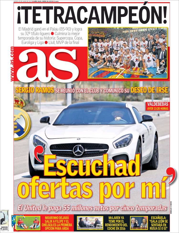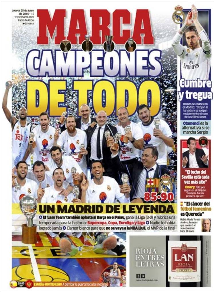 Hoy es mañana de gloria para el madridismo por la rúbrica de una temporada perfecta de la sección de baloncesto, protagonista de un registro de éxitos que podrá igualarse pero no superarse. Algunos periódicos otorgan al asunto más relevancia que otros.