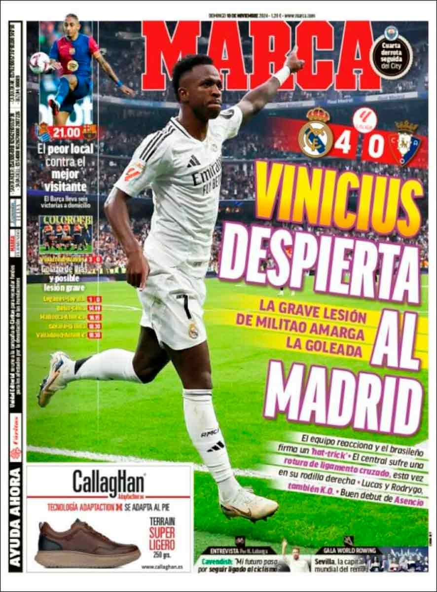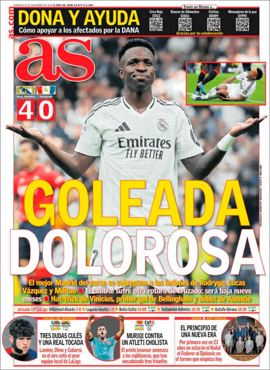 As titula «Goleada dolorosa» con acierto, porque, lamentablemente, el contrapunto amargo en forma de lesiones es dolorosísimo: Rodrygo tiene dañado el recto femoral derecho y al menos será baja durante un mes, Lucas Vázquez tiene afectado el aductor izquierdo y se estima que esté alejado de los terrenos de juego tres semanas, pero Militao se ha roto el cruzado de la rodilla derecha —la que no se lesionó el año pasado— y, lo que empeora la situación, tiene dañados ambos meniscos y estará en dique seco aproximadamente un año. Terrible para el jugador, a quien enviamos todo nuestro cariño y ánimo para afrontar una exigente recuperación que no albergamos dudas de que logrará, porque además ya ha demostrado que puede hacerlo.