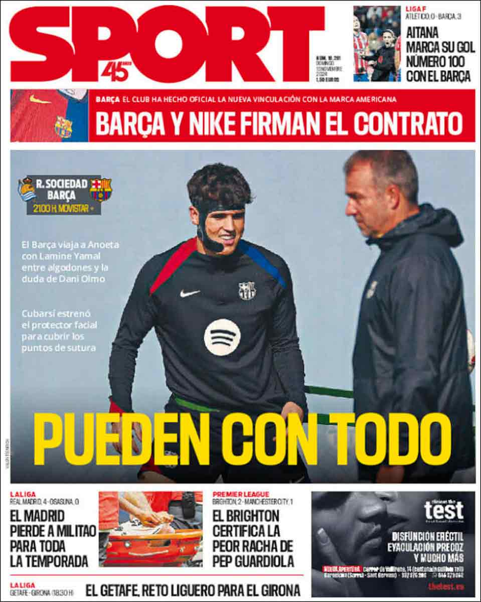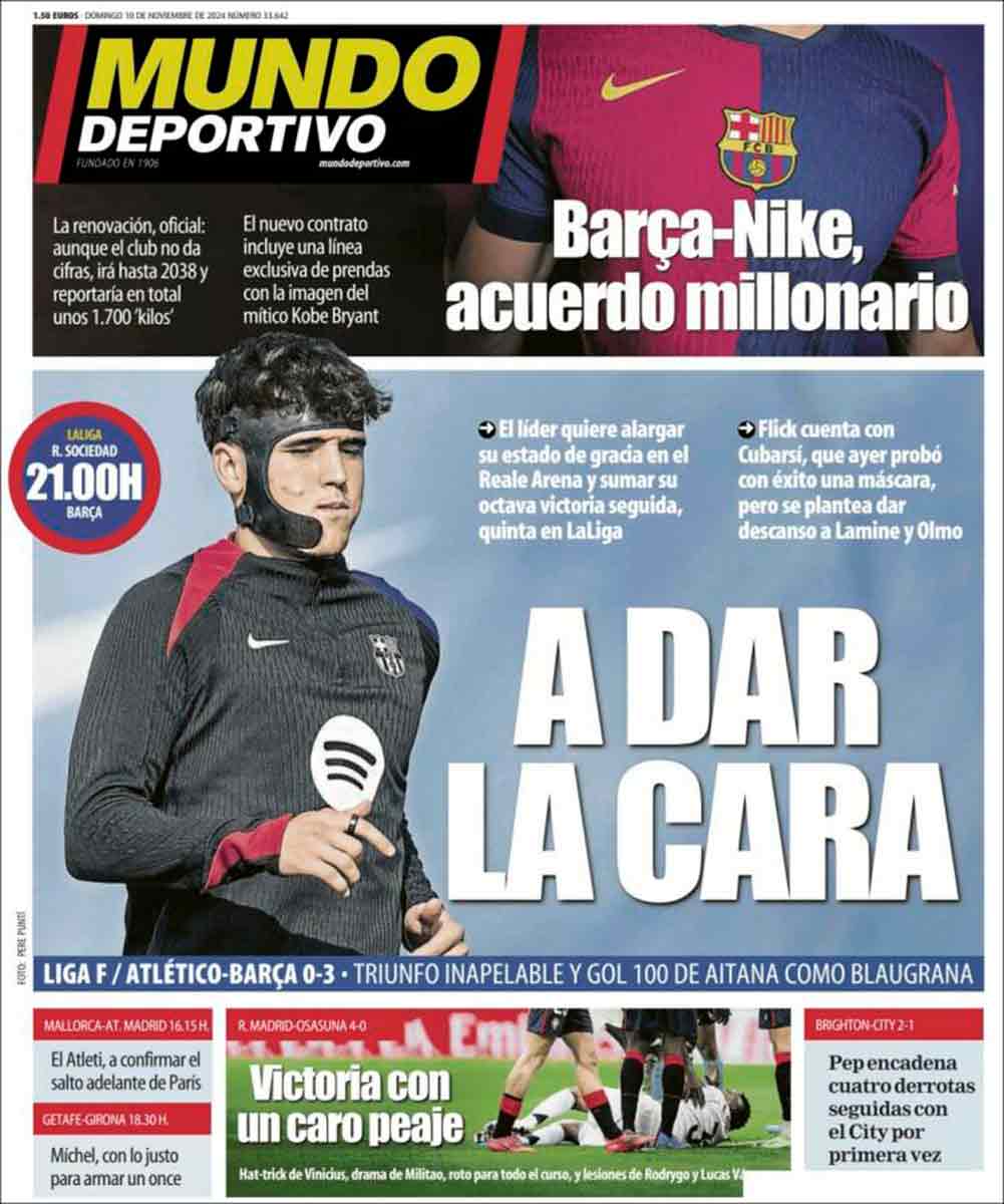 Al igual que Sport, Mundo Deportivo decida su portada a Cubarsí. A primera vista, el defensa parece haber cambiado de oficio y desempeñar ahora el puesto de teleoperador, pero es una ilusión óptica, el artefacto que le cubre el lateral de la mandíbula hasta la boca no es un micrófono, sino un máscara para proteger los puntos de sutura que le cosen esa zona del rostro.