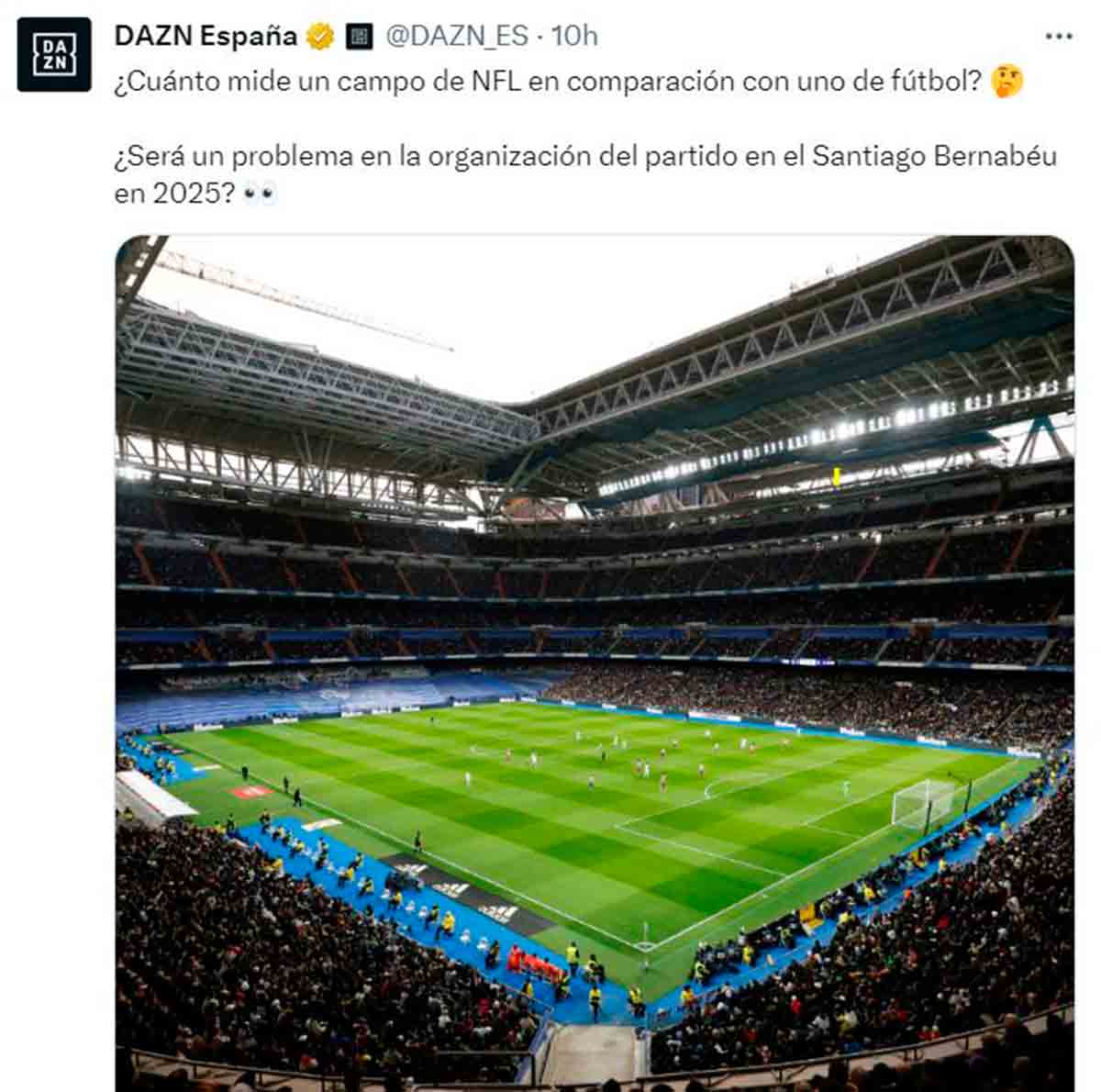 No pueden evitar escribir la palabra “problema” junto al nombre del Santiago Bernabéu, por mucho que el acuerdo sea un negocio excepcional de alcance planetario. Estamos seguros de que los dirigentes de la NFL, los mismos que tienen controlados al milímetro los segundos de publicidad de las pantallas, los artistas que amenizarán la velada, los acuerdos comerciales hasta de la marca de perritos que se venderán entre el público o los jugadores que acudirán a eventos comerciales y solidarios para promocionar la NFL en España, esos mismos tipos, decíamos, no han previsto las medidas del campo. Seguro que sí.