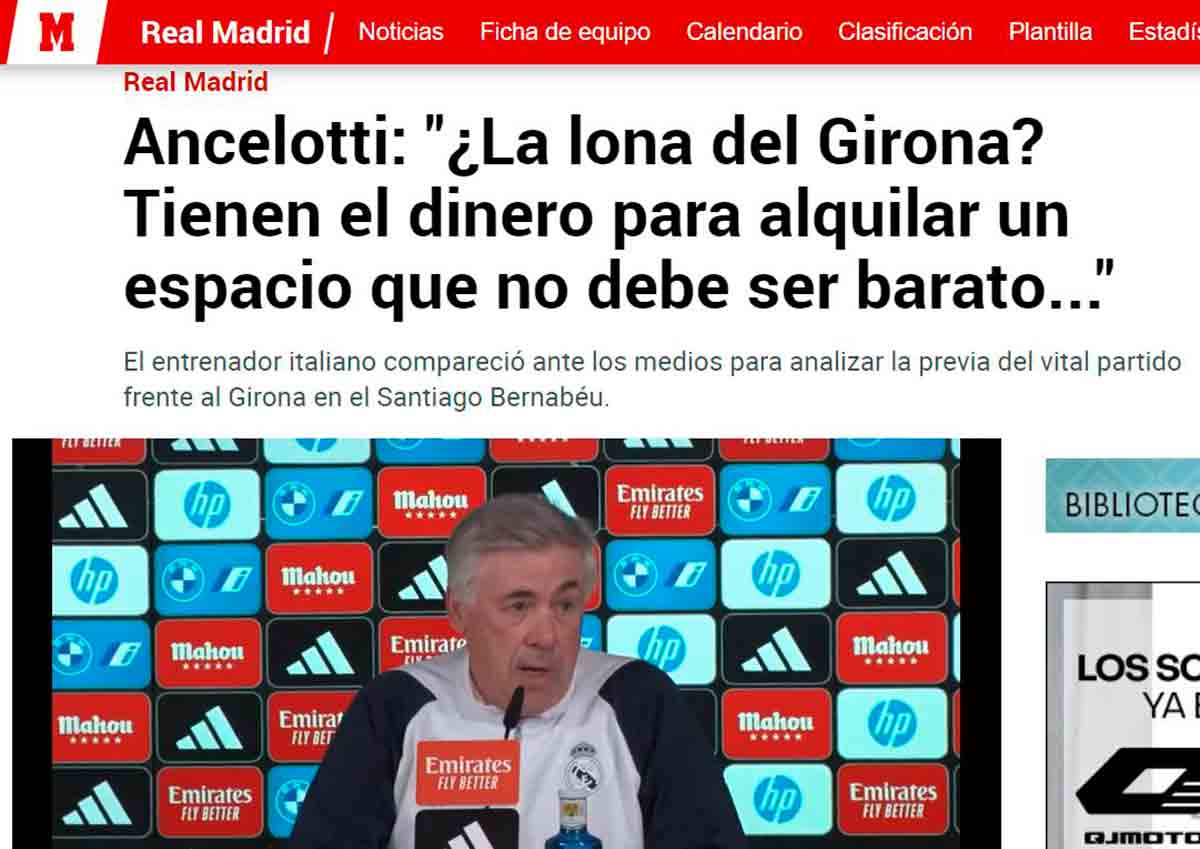 Una parte muy importante del título liguero pasa por el partido de esta tarde en el Santiago Bernabéu. El Real Madrid llega líder con solo dos puntos de ventaja -CTA mediante- sobre el sorprendente y meritorio Girona, ese equipo modesto y humilde pero con la capacidad económica suficiente como para pagar una inmensa lona publicitaria a cien metros de la Plaza Mayor. A preguntas de los periodistas, tan amantes del salseo y tan poco del juego en sí, el bueno de Carletto lo recordó atinadamente durante la rueda de prensa previa al encuentro.