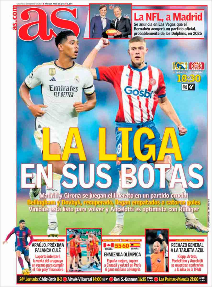 La portada de As centra su atención en los dos máximos goleadores del campeonato, Bellingham y el ucraniano Dovbyk, pero queremos llamar vuestra atención sobre la noticia que “cubre” sus cabezas. Ayer se anunció el acuerdo entre la NFL y el Real Madrid para acoger un partido oficial del campeonato de fútbol americano en el Santiago Bernabéu en 2025. El tiempo acaba poniendo a todo el mundo en su sitio. Los periodistas españoles se han dedicado durante los últimos años a escribir artículos despectivos sobre la reforma del estadio y llega el vicepresidente de la NFL, Peter O’Reilly, y te suelta que en su elección pesó mucho el aspecto del Santiago Bernabéu: “Nos dejó boquiabiertos”. Estupefactos, asombrados. Como nos quedamos todos al ver que enseguida hubo quienes se subieron al carro del éxito de este acuerdo.
