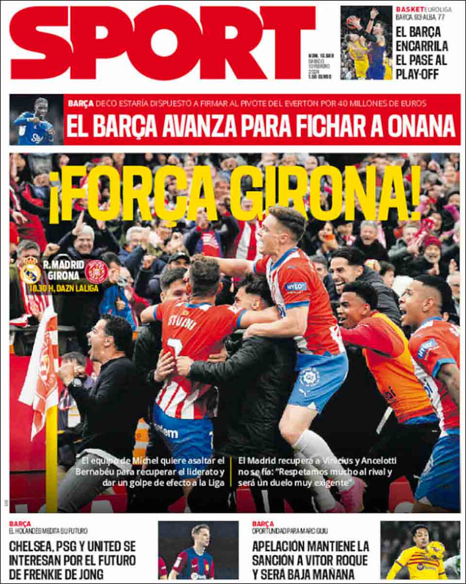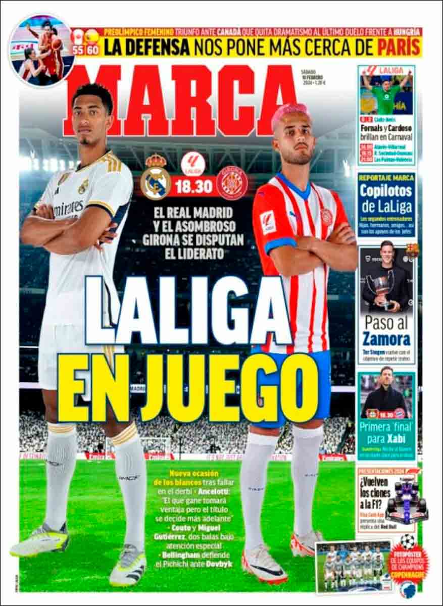 “La Liga en juego” sobre las imágenes de Hey Jude y Yan Couto. La victoria del Real Madrid destacaría a los nuestros con una ventaja de cinco puntos sobre “el asombroso” Girona, adjetivo escogido por el diario Marca para su portada y con el que estamos de acuerdo. Un asalto del Girona al Bernabéu volcaría la clasificación, pero estaría lejos de ser definitivo. Y el empate… el empate podría ser una magnífica opción para los perseguidores, bueno, para “ese” perseguidor. Difícil papeleta la de los mismos que la semana pasada perjudicaron al Real Madrid y anularon correctamente un gol al Girona. Y no digamos para los señores del VAR, que tendrán que decidir con las imágenes que les facilite la empresa de Jaume Roures (o exempresa tras el “maquillaje”), miembro del consejo asesor del Girona. No habrá polémica con los posibles conflictos de intereses del socio y avalista del Barça, como no los ha habido durante años con los innumerables conflictos de intereses que se han extendido por el fútbol patrio. Por ejemplo, con el hecho de que la televisión supuestamente imparcial GolTV sea en realidad la prolongación de BarçaTV, como pudo verse en el lamentable vídeo emitido ayer con imágenes manipuladas en las que se utilizaba la cara de Florentino Pérez.