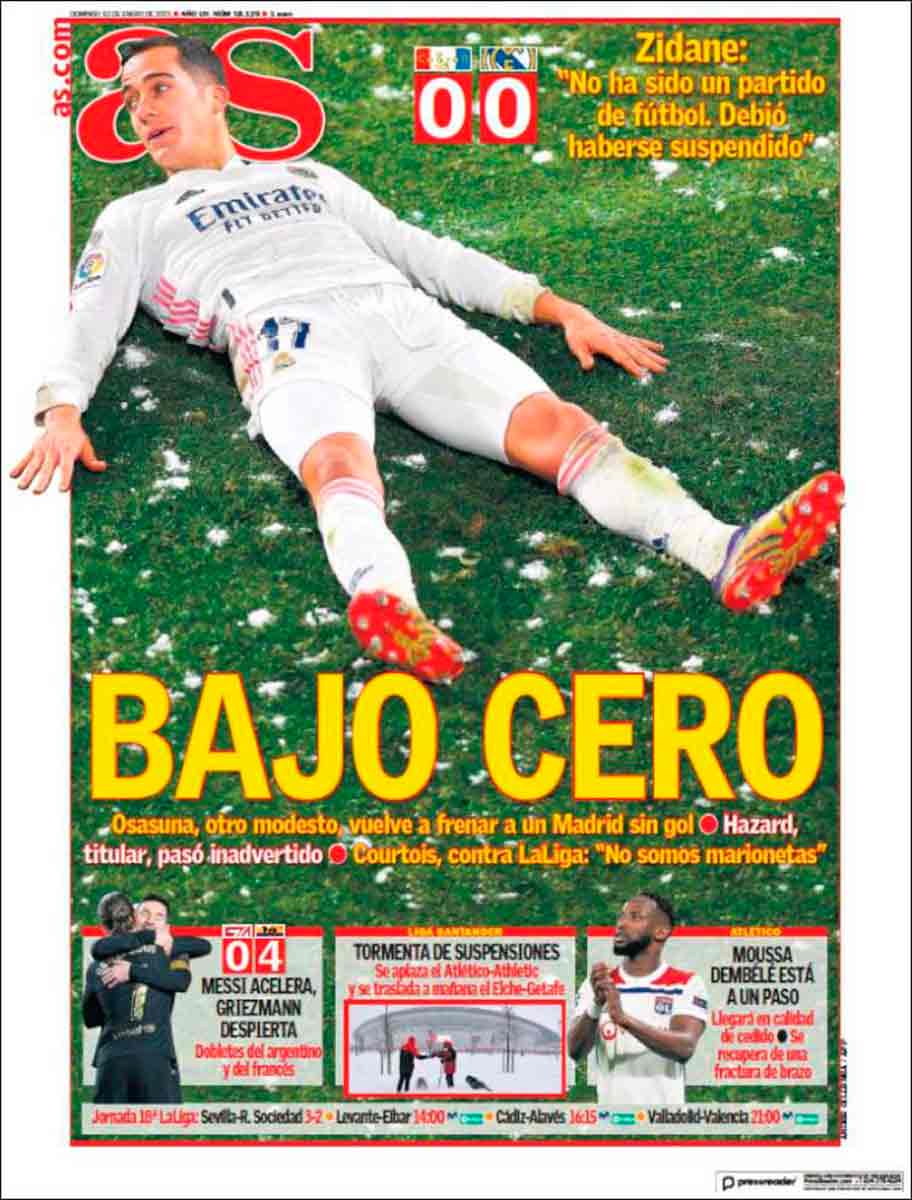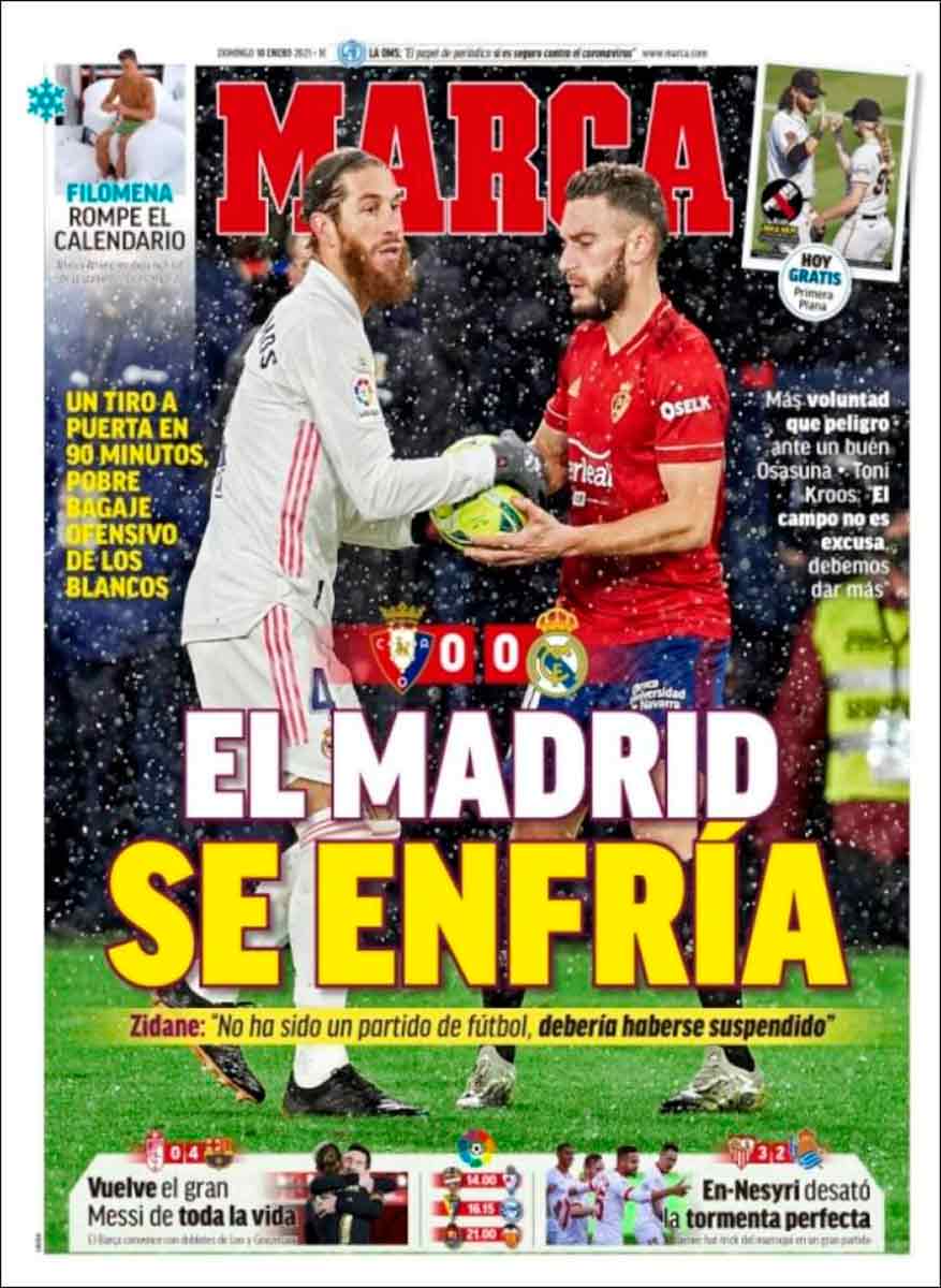 Hablan las portadas madrileñas de un Madrid frío, a tono con 'Filomena'. Hablan de las declaraciones de Zidane y Courtois, quejándose de las condiciones que rodearon la celebración del partido. Hablan de la irrelevancia de Hazard, que volvía al once inicial. Hablan de la escasa incidencia ofensiva del Madrid en El Sadar. Hablan de Kroos -vayan ustedes a hablarle de nieve a un alemán-, que no busca excusas en el estado del terreno de juego. Y hablan de lo que parece estar convirtiéndose en una tendencia negativa cada vez que el Madrid se enfrenta a un equipo de los llamados modestos, de esos que saben más guardar la ropa que nadar y que, con orden y disciplina táctica, complican la llegada del Madrid a portería.