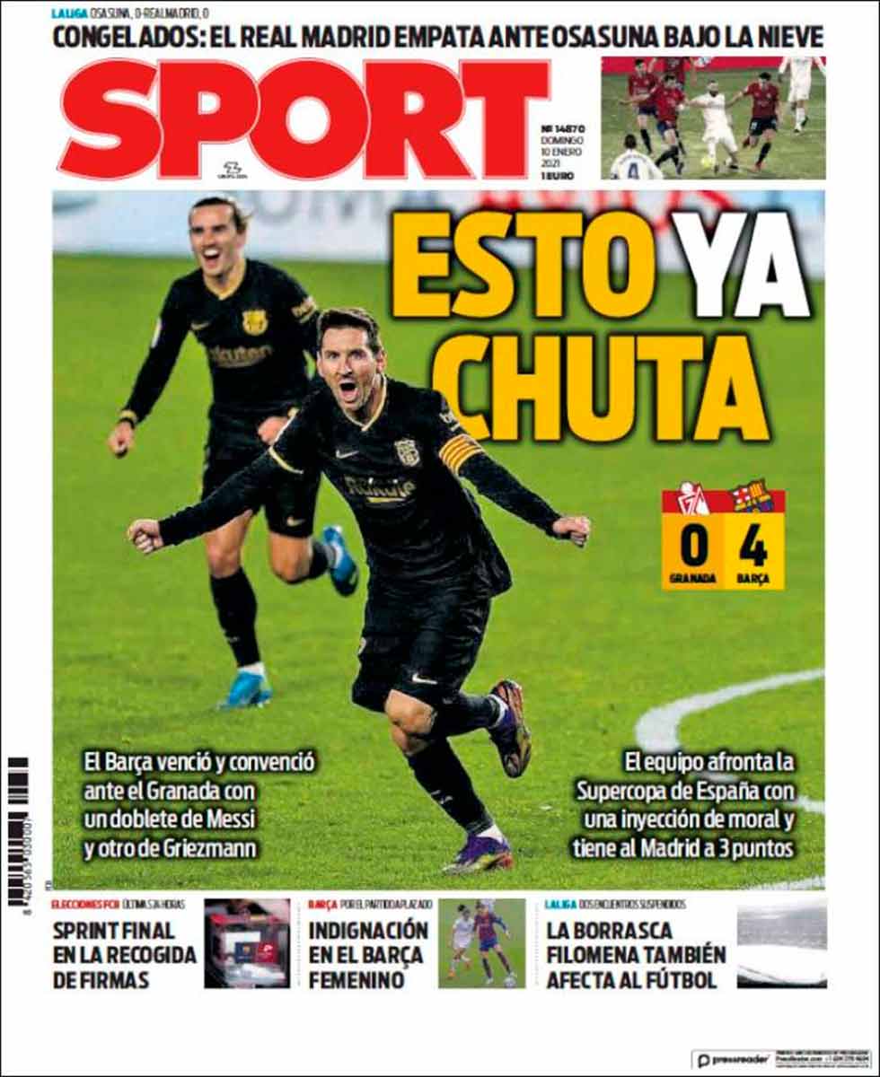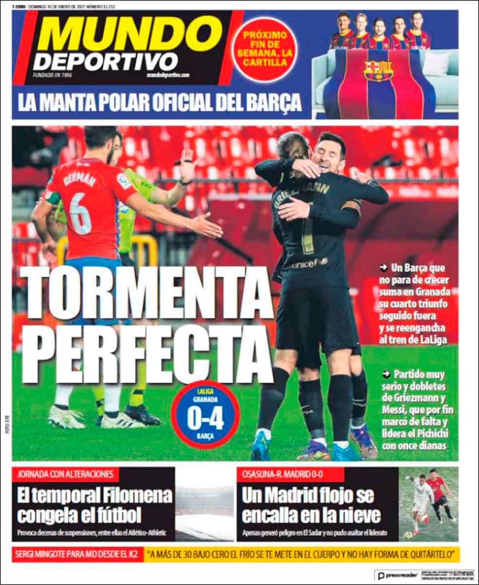 "Esto ya chuta", titula Sport, y no creemos que con "esto" se refieran a Messi, y tampoco queremos creer que con "esto" se refieran a Griezmann. "Tormenta perfecta", titula Mundo Deportivo, y aquí sí estamos seguros de que no se refieren a todo lo vivido por el Madrid desde que quiso efectivamente salir de Madrid, pasando más de tres horas en un avión sin despegar, pidiendo sin éxito el adelanto del partido contra Osasuna para evitar la nieve en el campo, llegando a saber más tarde que la jugada aquí referida había ocurrido más tarde y viéndose obligado por (casi) todo lo que le rodea a bajar la cabeza una vez más, porque un cuchillo sirve para cortar, un martillo sirve para clavar y la prensa sirve para que este portanálisis no tenga el más minimo asomo de señorío.