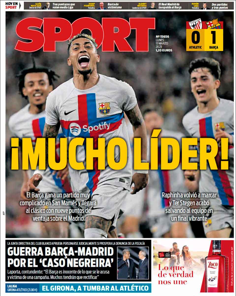El resto de la prensa deportiva del día habla de fútbol. Ya os decimos, como si el paciente estuviera en una isla paradisíaca, rodeado de champán y féminas lubricadas, en lugar de boquear en la UCI. Particularmente curiosa (o no) resulta la prensa cataculé, que saca pecho por la victoria culé (0-1 otra vez) en San Mamés.