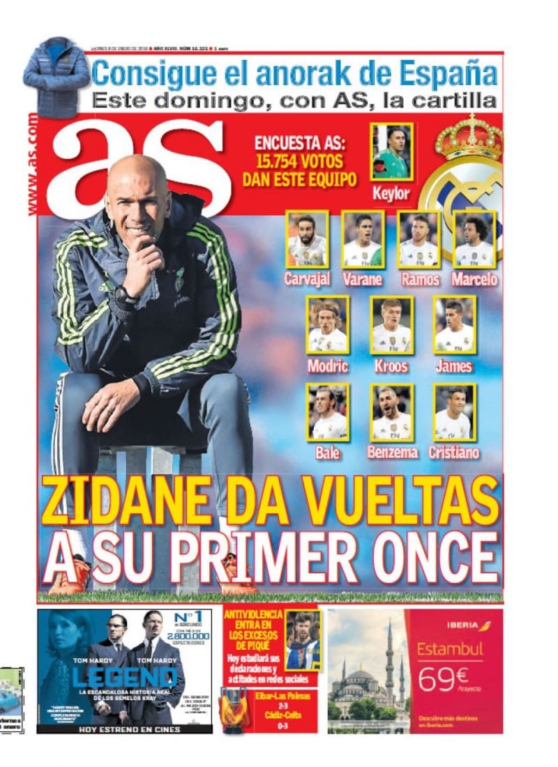 Otra cosa es su portada, tan elemental que haría sonrojar al Dr. Watson. “Zidane anda dando vueltas a su primer once” -como es lógico, dado que mañana jugamos contra el Depor- y la afición -ese concepto discutido y discutible que diría un ZP madridista- nos dicta su once desde la primera plana de As. Agárrense los machos porque el pipero lector de Ouija Today apuesta -con la excepción de Carvajal- por el once que fue arrasado esta temporada por el Barça en el Bernabéu. Luego algunos se extrañan por el esplendor de teorías políticas como el despotismo ilustrado.