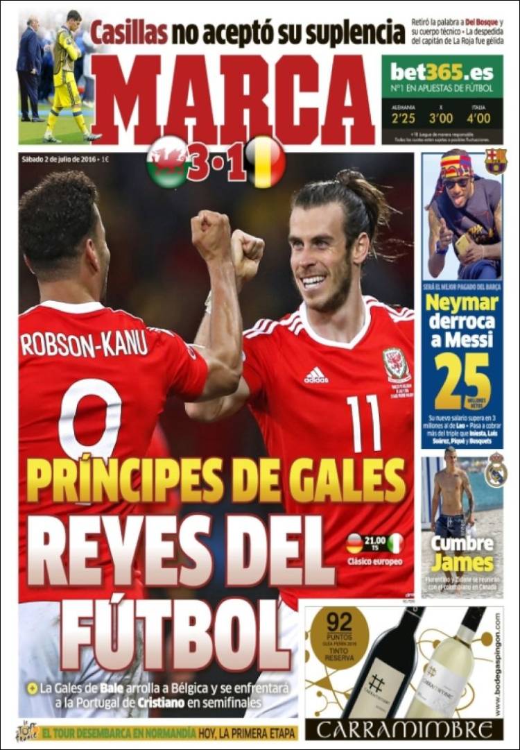 Lo que no dirán en la Ouija es que Gareth Bale disputará ante Cristiano Ronaldo las auténticas semifinales madridistas de la Eurocopa. Bueno sí, lo dicen en pequeñito desde la azotea de su portada, suponemos que para no agravar su ridículo creciente y su prestigio menguante. La que gusta en La Galerna es la primera plana flamígera de Marca, que sí otorga protagonismo a una noticia que dibuja sonrisas al madridismo. Minipunto para la Hernia en detrimento de la Ouija, cuyo futuro se adivina incierto si se empeña como se empeña en resolver sus propias cuitas personales.