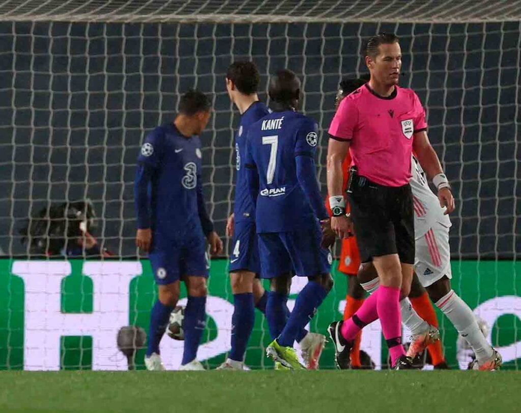 En la segunda mitad la nómina de amonestados creció solo en el bando madridista. Kroos por una entrada por detrás a Kanté en el 59', Marcelo por una patada a Pulisic cuando arrancaba en el 64', Varane por un pisotón a Havertz en el 77' y Odriozola por una obstrucción a Rüdiger en el 89' fueron los receptores. Al neerlandés le faltó sacar amarilla a Kanté por una entrada a Casemiro cuando ya había soltado el balón. El árbitro dejó la ley de la ventaja y luego no reprobó al francés.