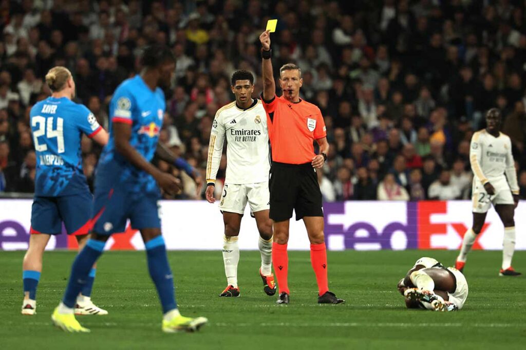 Sin jugadas peliagudas ni polémicas en las áreas desenfundó seis amarillas muy justas. En el Real Madrid fueron amonestados Vinicius en el 53' por un empujón a Orban en el cuello que estuvo al límite de otro color, a Tchouaméni en el 72' por derribar a Simmons y a Kroos en el 74' por cortar un avance también del neerlandés. Mientras que en los visitantes vieron la amarilla Schlager en el 19' por parar una contra de Vinicius, Raum en el 50' por agarrar a Rodrygo y Orban en el 71' por una dura entrada abajo a Bellingham.
