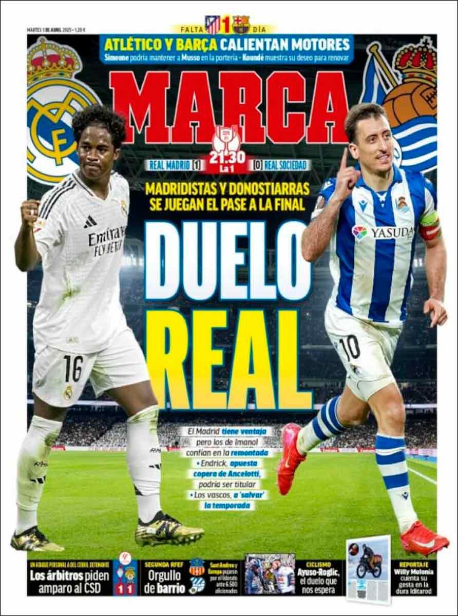 Como habéis visto, As habla mayormente del partido de Copa que esta noche (21:30) juegan los nuestros ante la Real, con un ojo y medio pie puesto en la final de Copa. También lo hace Marca, como veréis a continuación. El rotativo dirigido por Gallardo es hoy un óvulo que se muestra impermeable a cuantos espermatozoides (aluminosis, timos de palco, etcétera) le rondan. Es un óvulo, no nos engañemos, al que Javier Tebas ha provisto del más infalible de los cinturones de castidad.