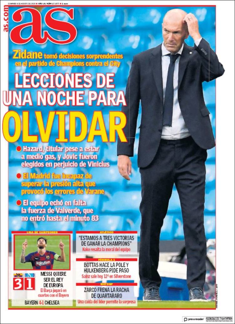 Respecto a la Champions, mis preferencias ahora son: Atalanta, Lyon, Leipzig, PSG (a ver si le diera a Mbappé por ganarla y venir entonces a Madrid, como hizo Ronaldo en su día con el ManU), Malakito, Bayern y.... que quede desierto el título.