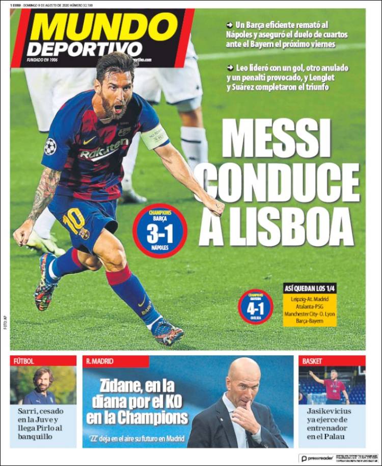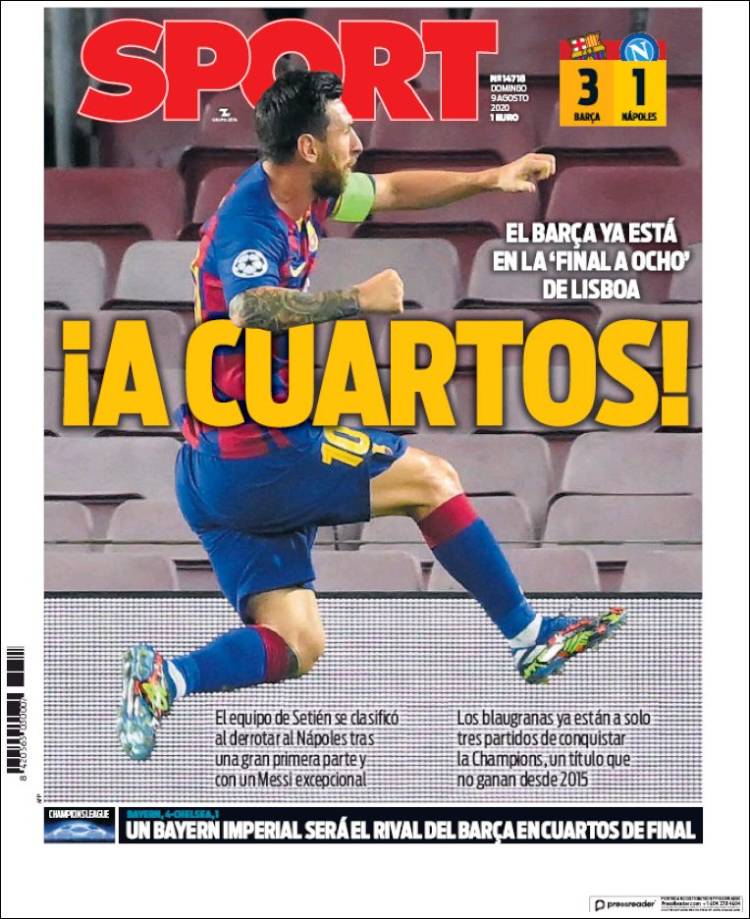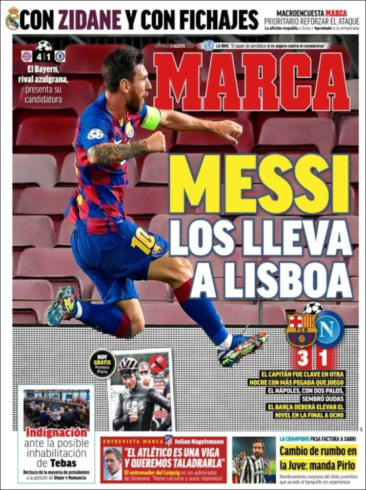 Ayer pasó de ronda el Barcelona frente al Nápoles y Marca sale con tal noticia a cinco columnas, exactamente con la misma foto celebratoria de Messi que presenta el diario Sport. No dudamos de que sea la noticia deportiva del día a escala nacional, pero imaginen por un segundo que fuera el Madrid el vencedor y ahora imaginen la portada de Sport al día siguiente. Les sugerimos algunos posibles titulares para reflejar precisamente lo que también sería la noticia deportiva del día vista desde la aldea gala: "Valverde da el OK a Bellerín", "De Jong se compra una casa en Torroella de Montgrí", "Los abuelos de Lautaro visitan la Masía", "Messi se corta las uñas de los pies"...