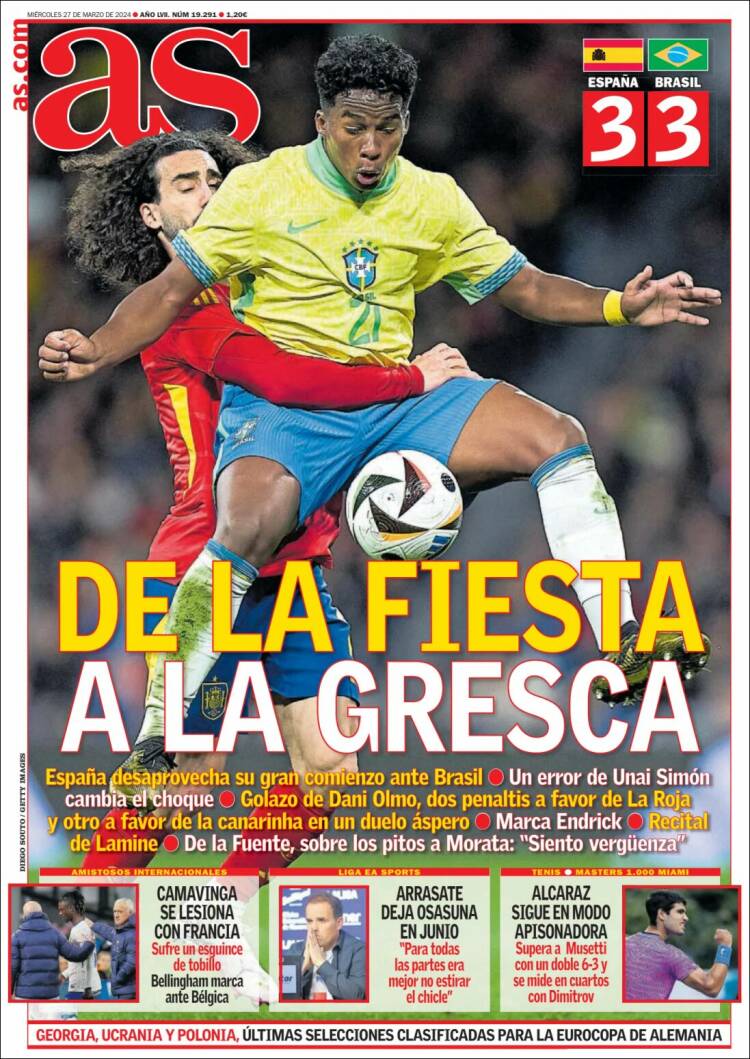 En materia puramente futbolística, el encuentro España-Brasil estuvo entretenido, fundamentalmente por la flojedad de ambas líneas defensivas. Llama la atención que Marca reconozca que “el árbitro regala dos penaltis a La Roja”. Cómo debieron ser ambas acciones, una sobre el héroe Yamal y otra sobre Dani Carvajal, para que un diario tan patriota y tan escasamente imparcial como Marca - cuando se trata de valorar a la selección española, obviamente – escriba en portada que ambos penaltis solo existieron en la mente del colegiado portugués, criado tal vez en los alrededores de la Ciudad de Las Rozas.