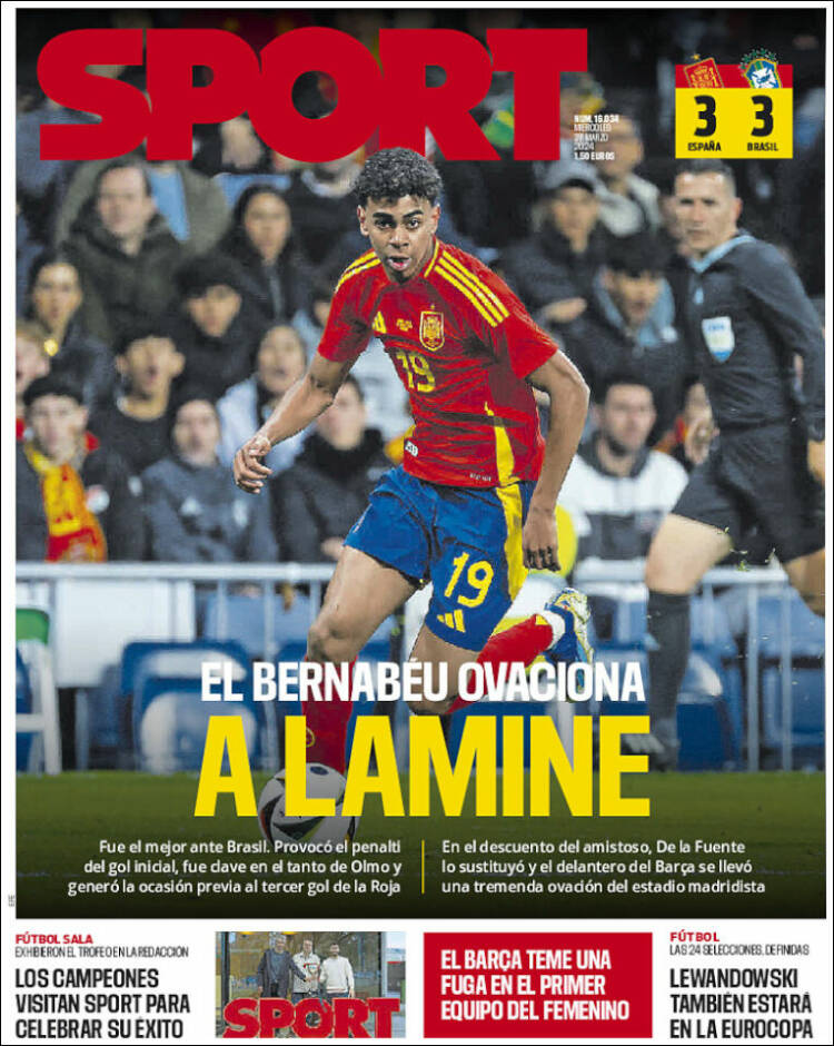 Curiosamente, las dos portadas de los deportivos catalanes sí se centran únicamente en Lamine y en el hecho de haber sido despedido como un emperador romano del recinto merengue. Está claro que a Sport y al diario del Conde de Godó, Grande de España, les importaba un comino el amistoso de anoche, pero les vino de perlas que su más reciente ídolo fuera encumbrado a los altares precisamente en el feudo del peor enemigo de su amado club, el FC Barcelona. “Laminho” en uno de esos dudosos juegos de palabras que de vez en cuando nos agasaja Mundo Deportivo. “El Bernabéu ovaciona a Lamine” tiene algo más de clase que el de su vecino de ciudad. Ni Mundo Deportivo ni Sport hablan de la infantil pataleta de De la Fuente, para que vean lo poco que les importa dicho comentario, y eso que podrían haber aprovechado dicho velado dardo para atacar, como tienen por costumbre, al madridismo.