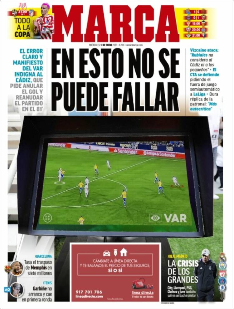 Ya lo veis. Portada completa para el affair ilicitano, poniendo el grito en el cielo por el desaguisado llevado a cabo por el equipo de jueces del choque. Muy bien, pero si comparas la preponderancia que se le da a esto con el nulo alcance que ha tenido la noticia de que el propio CTA admita que el gol del triunfo del Villarreal al Real Madrid no debería haber acontecido, dado que ese penalti jamás se debió señalar, te quedas de piedra. Por no hablar (hay muchos más ejemplos) de la sucesión de catastróficas desdichas arbitrales que le costaron la Liga a los de Zidane en su último año como entrenador blanco. Jamás vimos una portada así, y mira que hubo ocasiones para ello.