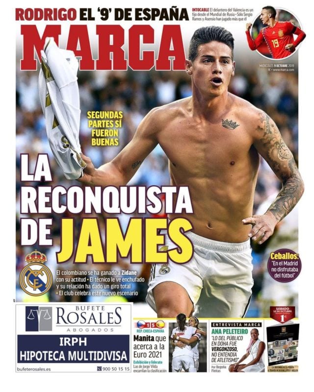Después de la tormenta, algo de calma. James sale en portada de 'Marca' y lo hace envuelto por un tono agradable y reivindicativo. El colombiano se ha ganado a la afición del Real Madrid -de nuevo- y se está ganando poco a poco a Zidane. Viendo lo que hizo ante el Granada se puede entender mejor. Jugó poco más de diez minutos en los que robó tres balones y marcó un gol. Implicación y desequilibrio. Nos encantaría que a James le saliera una temporada maravillosa.