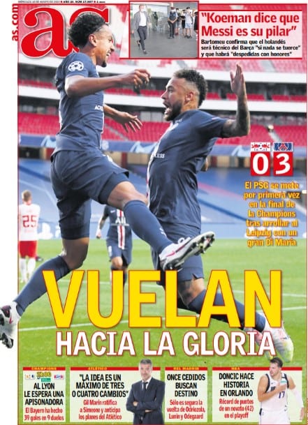 As, por su parte, otorga el protagonismo a la convincente goleada frente al Leipzig (o el Legazpi) con la que ayer se abrió paso en su primera Final de Champions el PSG. La sensacional actuación de Di María en el partido desató el afán plañidero de unas cuantas viudas del argentino, escandalizadas ante el calamitoso error que al parecer supuso su marcha del Madrid. Muy mal, Florentino. Se va Di María y solo eres capaz de conseguir 3 de las siguientes 4 Champions. Hay errores groseros que se pagan.
