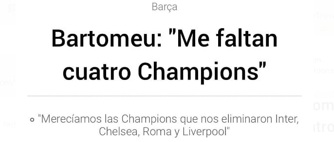 Que sí. Que habéis leído bien. “Me faltan cuatro Champions. La merecimos cuando nos eliminó el Inter, el Chelsea, la Roma y el Liverpool”.