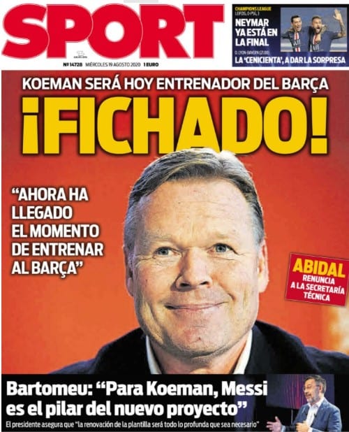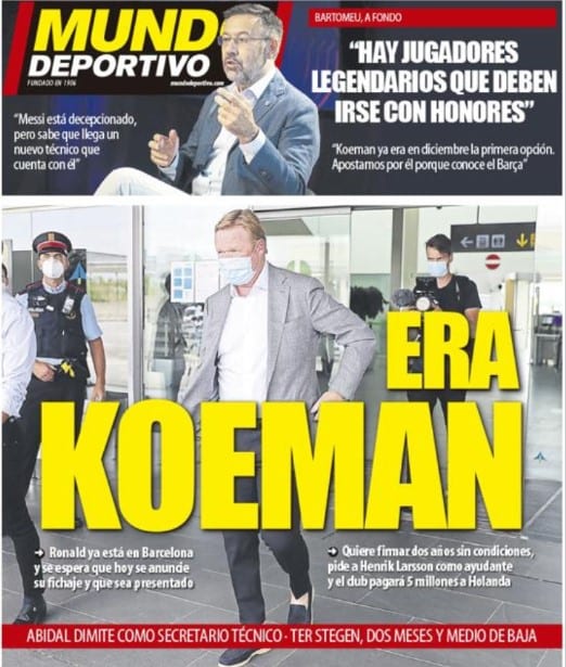 El cobrador del frac, ya casi contratado por el inefable Barto para que el fútbol pague por fin las Champions que aparentemente debe (aunque haya movido a la vergüenza el trayecto del Barça en pos de las mismas), es para los blaugranas Ronald Koeman, por supuesto. Sport ilustra esta realidad con un primer plano del holandés sobre un fondo naranja, tal vez para rubricar lo dicho en el portanálisis de ayer, es decir, que es la reencarnación de Naranjito quien se hace cargo de la dirección técnica del Barça con sus resonancias del 82 (o del 8-2). Le deseamos la mejor de las suertes a Koeman, muy especialmente en la crucial reunión con Messi prevista para los próximos días.