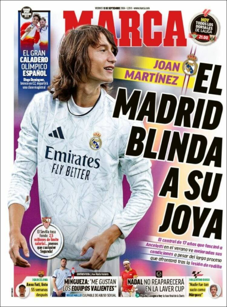 Para finalizar tenemos a Marca, que contra todo pronóstico dedica su primera plana a cierto club que es vigente campeón de liga y Champions pero que habitualmente solo sirve para malmeter en su contra. Pedid un deseo, porque hoy Marca se hace eco de algo positivo: el bonito gesto del club blanco, renovando su fe en un futbolista joven y talentoso en el comienzo de su recuperación de una grave lesión. Bien por el Madrid y ánimo al chico, Joan Martínez, que tiene unas condiciones bárbaras. Suerte también a Gavi, en el otro lado del puente aéreo, en su reincorporación a los terrenos de juego.
