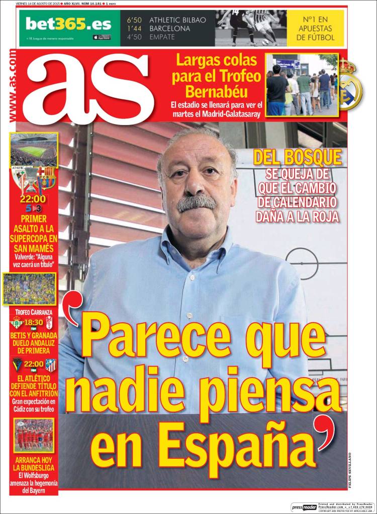 Del Bosque sí se queja en cambio, en la portada de As, de un cambio de calendario de la Liga que por lo visto afecta a la selección. Así, llega a nuestros ojos con semblante que denota gran severidad.