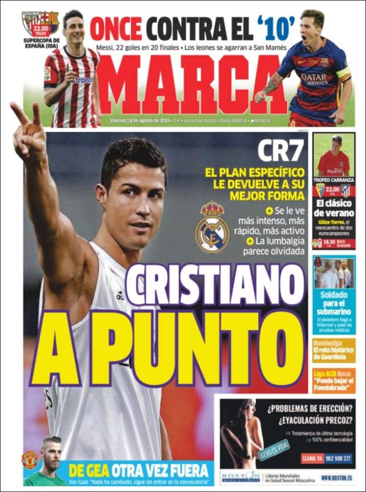 Buenos días. Cristiano Ronaldo vuelve hoy a la portada de una de las grandes cabeceras deportivas, y lo hace para inocular en nuestros maltrechos corazones madridistas algo de fe, esperanza e incluso caridad, tan necesaria esta última virtud teologal -y si no que nos contradiga el Padre Suances- para sobrellevar los accesos de cólera más impíos a que nos inducen tipos como Piqué. Y el que Cristiano vuelva a protagonizar esta edición de Marca nos sirve para reflexionar un poco a cuenta de un reciente artículo en La Galerna ("Cristiano, asúmelo") firmado por nuestro colaborador Quillo Barrios. Su artículo da para mucho.
