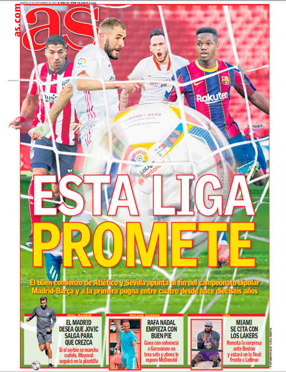 Les mostramos la primera plana de As por si tienen interés, porque la portada en sí carece de él. «Esta Liga promete» titula el diario madrileño sobre un fotomontaje anodino que tiene el mismo interés que el diseño de un pack de yogures de marca blanca.