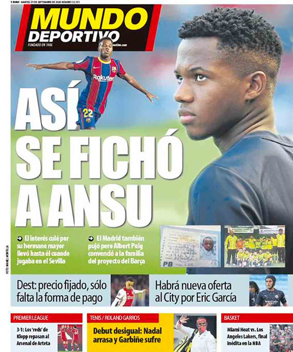 Mundo Deportivo opta por una portada sensiblera. Muestra el perfil místico de un Ansu Fati vestido de paisano que parece soñar con ser una estrella del fútbol. Mira hacia arriba y se ve a sí mismo con la camiseta azulgrana celebrando un gol. No nos parece bien, se trata de un truco hollywoodiense para tocar la fibra sensible del lector débil y manipular sus sentimientos. Muy mal.