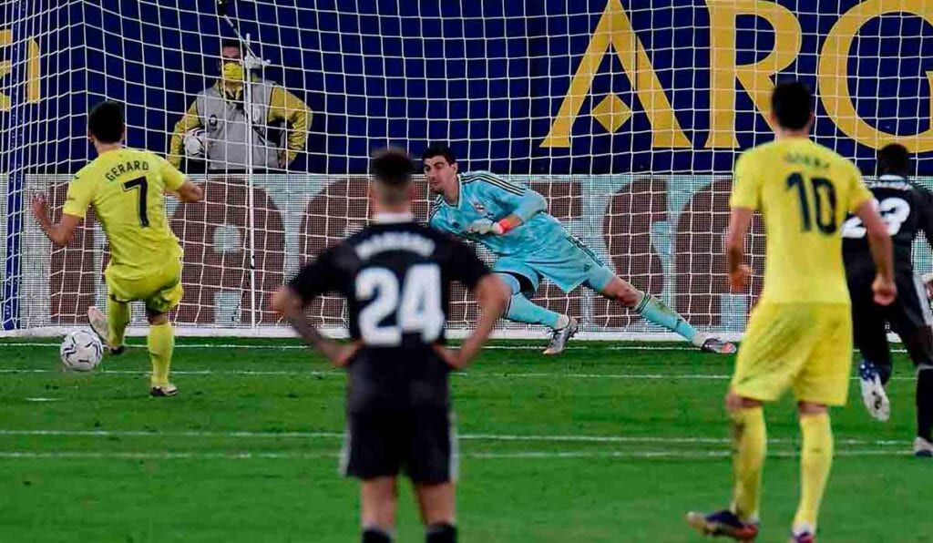 Carvajal arriesga demasiado, Varane hace lo propio en sentido contrario y el sistema se rompe debilitado por la ausencia de Lucas. Chukwueze lee perfectamente la situación y lanza un desmarque perfecto. Kroos también se desconecta incomprensiblemente. Balón en profundidad con buen timing, Varane demasiado lejos y Courtois completa la cadena de errores saliendo algo tarde. Por cierto, muestra una vez más del impacto que tiene la figura de Casemiro en estas situaciones.