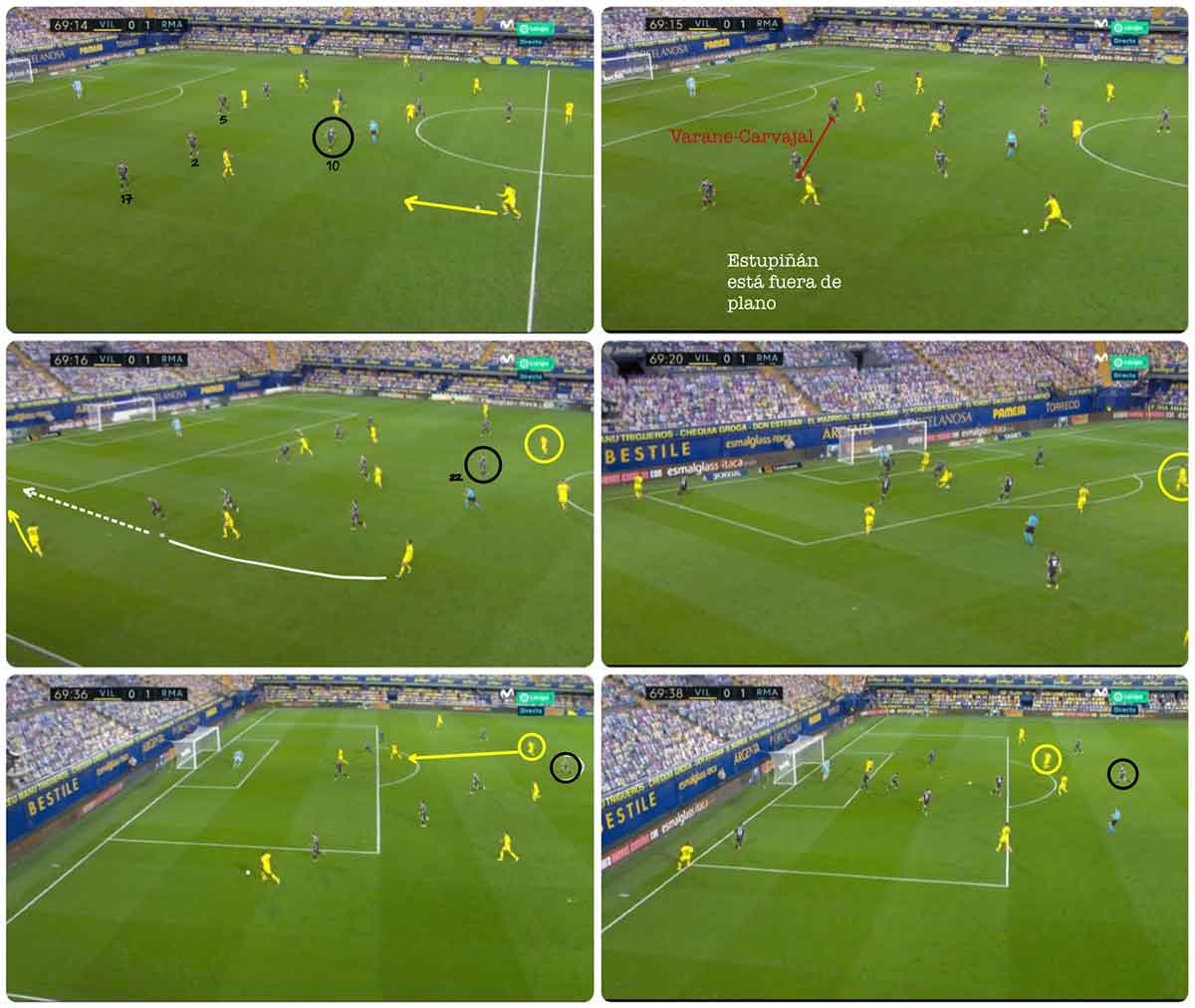 Modric no reacciona ante el avance de Pau Torres. Y eso, sumado a una posición de Lucas mucho más profunda que en la primera parte, facilita que Estupiñán gane con facilidad la línea de fondo. Importante quedarnos con la excesiva distancia entre Carvajal y Varane. Por cierto, desconexión también de Isco que no llega a proteger la frontal.