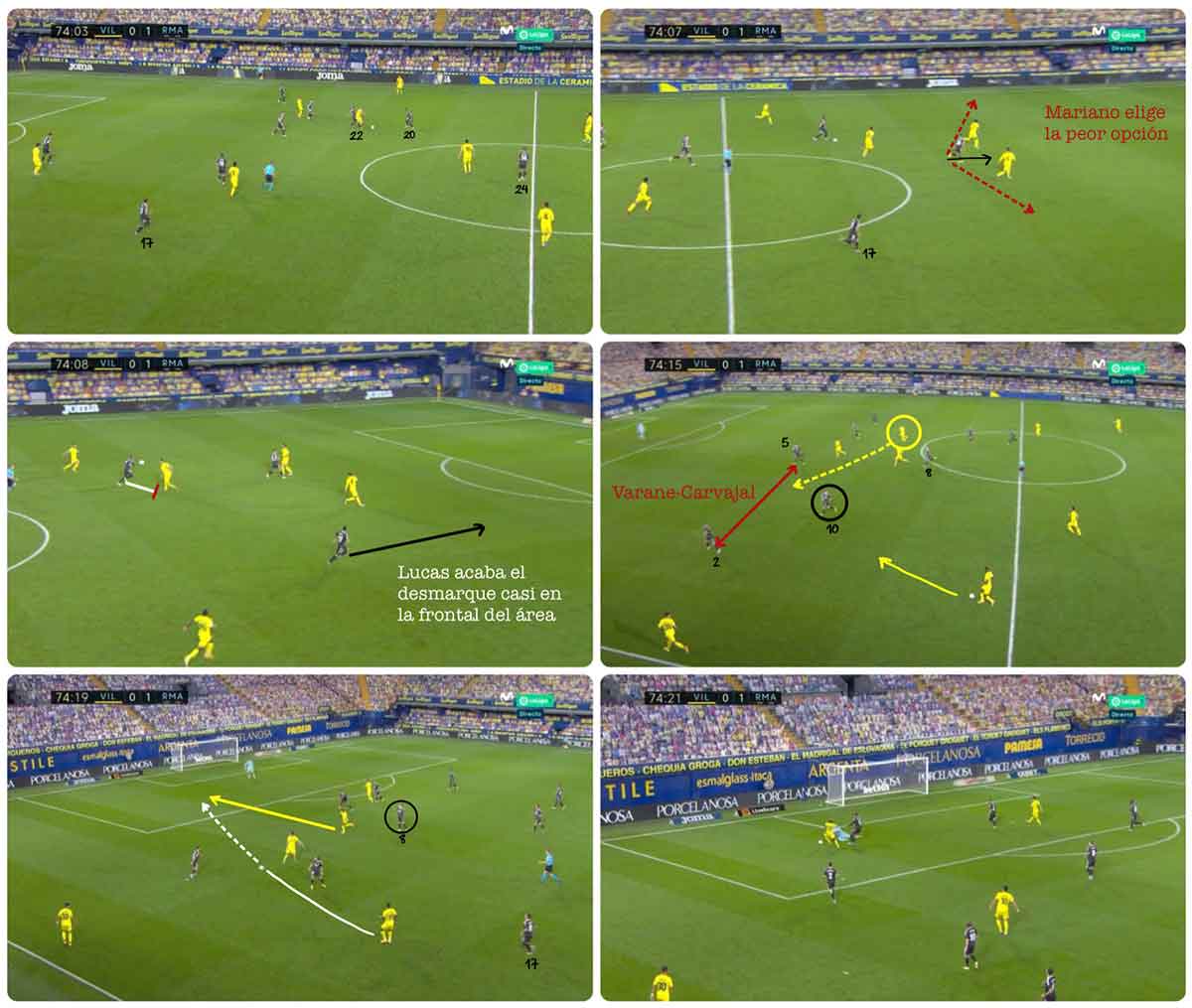 El primer error es el movimiento que realiza Mariano. Bloquea el avance de Vinicius y facilitando el trabajo de los defensas, eliminándose a sí mismo de la jugada. Acto seguido, Vinicius falla en el pase a Lucas y se desata el desastre. Recupera el Villarreal y Lucas queda eliminado.