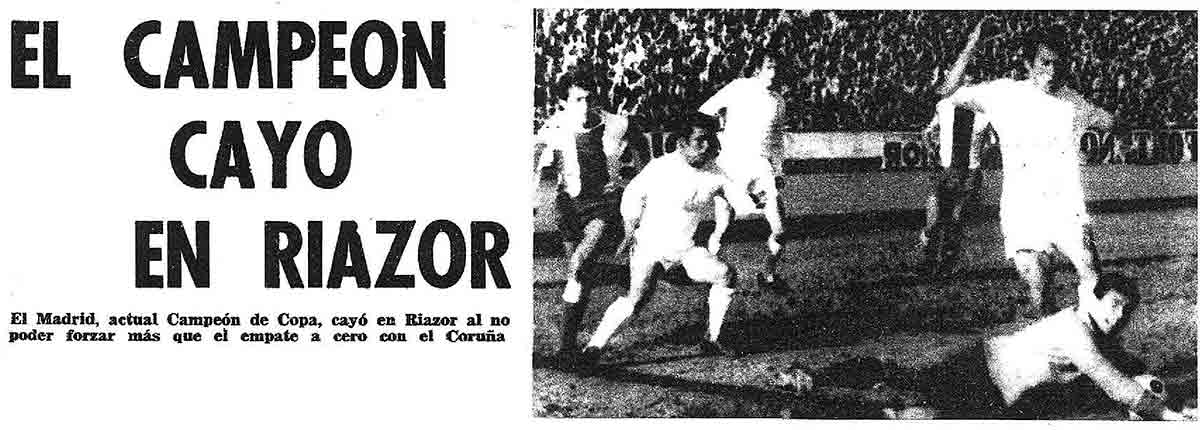 Una temporada más tarde la sorpresa fue morrocotuda, porque el cuadro dirigido por Lippo Hertzka acababa de ganar su primera Liga y además de forma invicta. El Deportivo, por su parte, terminó en el sexto lugar de la clasificación de Segunda y nadie esperaba una machada como aquella. En octavos, en Riazor, el equipo blanco salió con un equipo muy competitivo, con la defensa mítica formada por Quincoces y Ciriaco, con Leoncito en la media, con el gran Luis Regueiro o el delantero Olivares. También, actuó un Gaspar Rubio recién regresado a España tras su espantada a Cuba dos años antes. Un retorno que no acabó bien por problemas internos que tuvo en el vestuario el jugador valenciano. En Coruña, los locales comandados por Chacho ganaron por 2-0 y el Madrid F.C. en Chamartín, el día de San Isidro, solo se impuso por la mínima (2-1). Una derrota dura y que escoció en la capital.