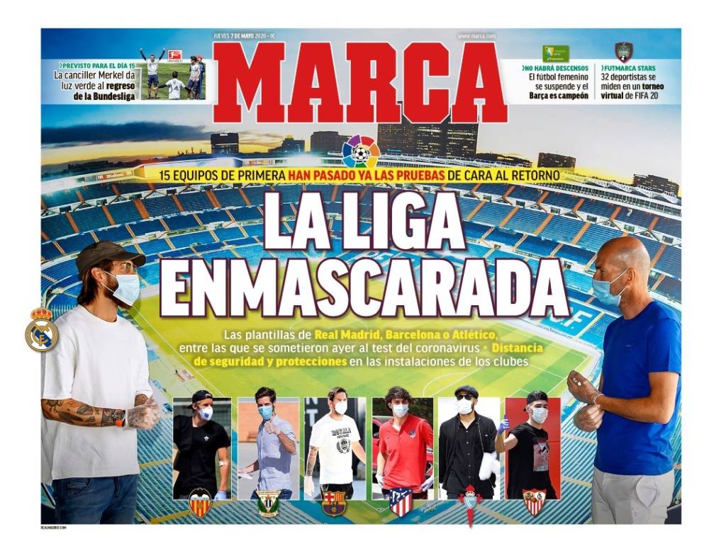 En esta edición sabanera apaisada, Marca nos muestra a nuestro capitán y entrenador en mascarilla saludándose con el debido respeto y, sobre todo, con la debida distancia de seguridad; lo que nos plantea la duda de cómo diantres vamos a jugar así al fútbol de élite al que, por cierto ya ha dado luz verde la forofa de Merkel en los Länders.