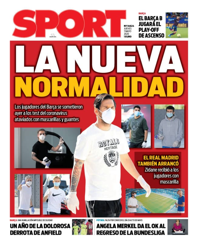 Y si parecía evidente que los diarios deportivos pudieran coincidir en su selección de imagen de portada, entrenador y capitán blanco mediante, ni qué decir tiene lo de las primeras planas de la prensa sportiva catalana. Ambas cabeceras coinciden, claro está, llevando a primera página la imagen en mascarilla del canterano, futbolista, capitán, directivo, CEO, presidente y propietario del Barcelona, Leo Messi. Aunque al menos, nuestros amics del Sport, nos han regalado otra imagen a nuestro juicio mas divertida que no es otra que la de Luis Suárez impedido para dar bocados en hombros transalpinos o lo que se tercie.