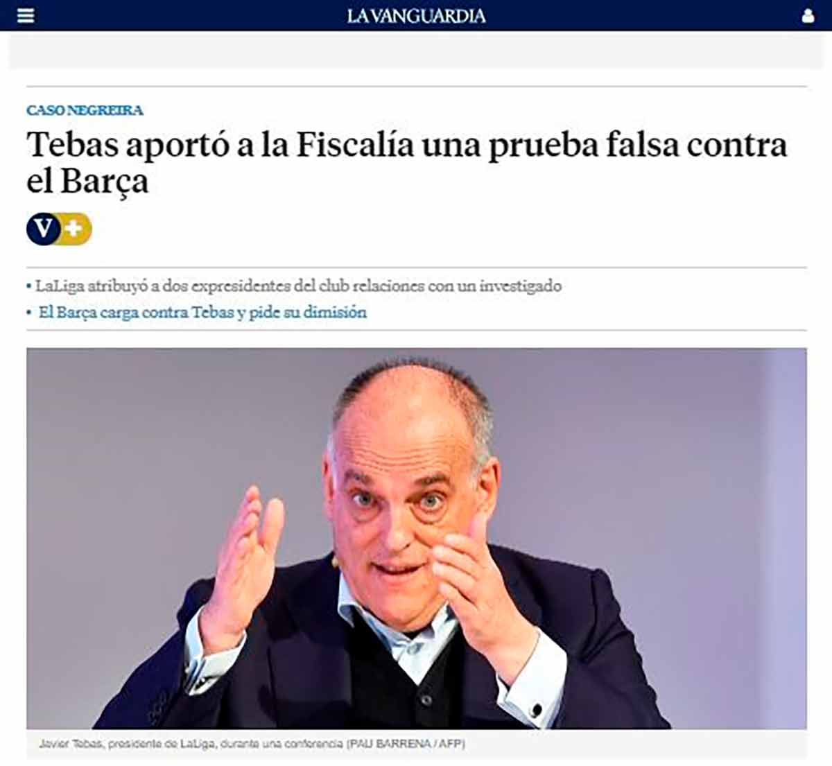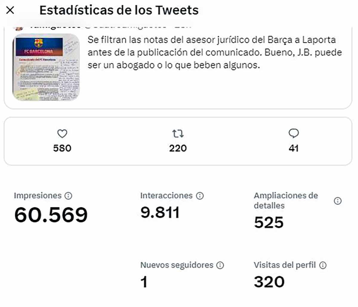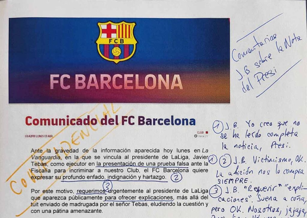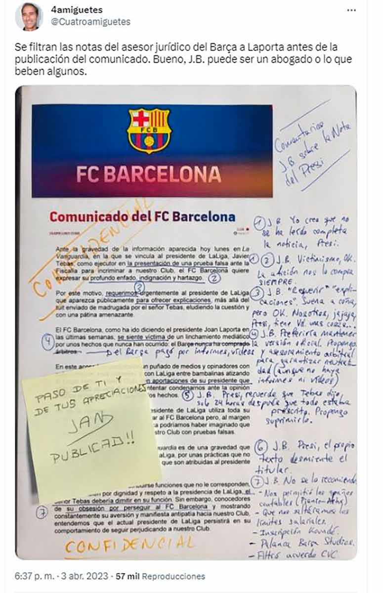 El mencionado tuit (prueba de cargo e intento de descargo nº 1) hacía referencia al comunicado publicado en la tarde del mismo 3 de abril de 2023 por el Fútbol Club Barcelona en el que requería explicaciones inmediatas al presidente de LaLiga, D. Javier Tebas, sobre la información aparecida en el diario La Vanguardia.