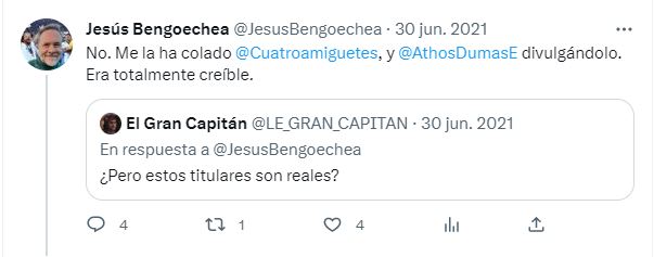 Uno es consciente de su capacidad de convicción incluso cuando miente, por lo que sabe desde hoy que debe obrar con cuidado, puesto que personas de reconocida cultura y conocimiento cayeron igualmente presas de su credulidad y dieron pábulo y retuiteo a tal coña marinera: