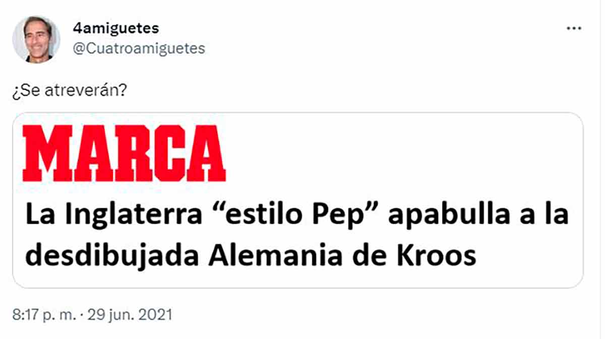 Como no quisiera este humilde autor/tuitero tener que afrontar una cuantiosa indemnización con la que el ofendido club pudiera el día de mañana plantear el fichaje de Haaland o Mbappé (o de ambos a la vez, puesto que es de dominio público los suculentos honorarios que recibimos los autores galernautas), DESMIENTO PÚBLICAMENTE TODO LO DICHO y hago el firme propósito de no incurrir de nuevo en dichas prácticas. Y a mayor abundamiento de mi incontinencia verbal (intento de descargo nº 5) y ausencia de mala fe, les remito otro tuit falso que escribí en su momento (29 de junio de 2021) con motivo de la Eurocopa de Naciones con el que trataba de denunciar el doble rasero del diario madrileño Marca, tan antimadridista en ocasiones como proculé, ambos términos proferidos con absoluto respeto y sin ánimo de ofender: