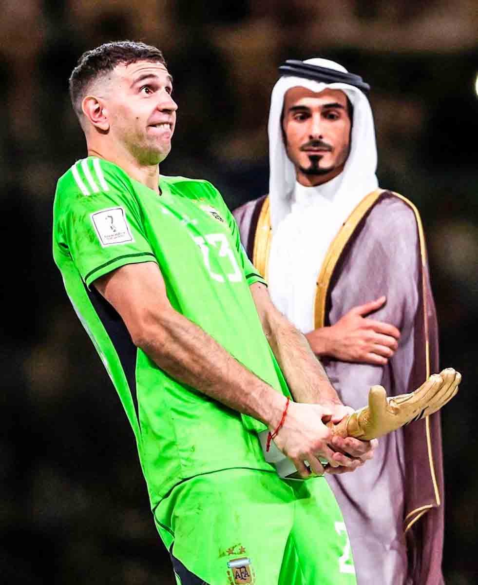 La gente se define por sus actos, en especial cuando gana. El Dibu Martínez acaba de ganar un mundial y los primero que se ocurre es hacer un gesto obsceno con el Guante de Oro. El jeque lo mira con indisimulado deseo.