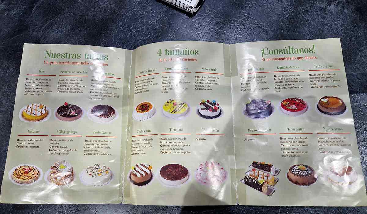 A mí, que me registren. Cuando termina el proceso le indico que también estamos interesados en contratar la tarta con ellos. Acto seguido saca de debajo del mostrador un tríptico peor conservado que El Jardín de las Delicias de El Bosco con la fotografía de 18 tartas. Los dobleces están pegados con celo. Todo muy vintage.