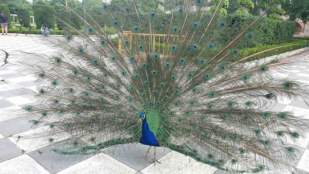 Al atravesar dichos jardines, nos topamos con una jauría de pavos reales de coloridas colas enhiestas (no Iniestas, que era el compañero de Perlita de Catar) entonando estridentes gritos amorosos hacia las pavas. Mas ninguna pava presta atención a ningún pavo y los ignoran por completo. Ante tamaño desaire, el pavo más grande, herido en su orgullo, decide perseguir a un jubilado que, este sí, no puede resistirse a sus encantos. Minutos después, el jubilado pone un huevo que procede a empollar. La pareja humana del jubilado ponedor es ahora quien se enoja, gritando improperios a su marido (de quien dice que es más feo que Spasic) y al pavo con quien se acaba de aparear. Le llama calzonazos (al marido), le quita la tarjeta de El Corte Inglés, la cartilla de ahorros de Caja Madrid y se marcha con gesto digno y paso firme. En el fondo, ella siempre quiso que su esposo se liara con un pavo real para poder ser libre y dilapidar los ahorros de toda una vida en las rebajas.