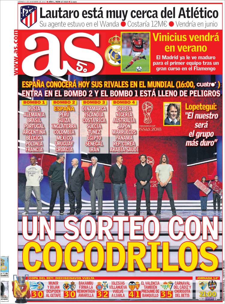 Por lo demás, hoy hay sorteo del Mundial y le deseamos la mejor de las suertes a España y a todos los demás. (La portada de Marca tiene ingenio y la de As habla de cocodrilos, que es como si Prince -o TAFKAP- hablara de womanizers).