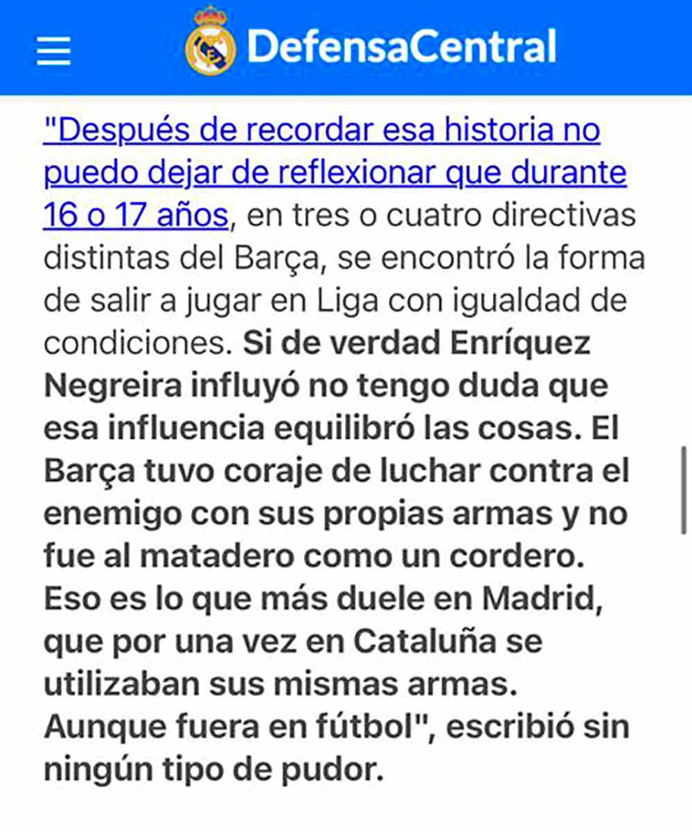 Justo escasos minutos antes de iniciar esta lectura he hablado con un amigo, también madridista, y me explicaba que hace unos días coincidió con el manager general (muy madridista) de un prestigioso modisto italiano , que regenta también negocios en otros sectores, quien vaciló -poniendo en un compromiso- a un ex directivo del farça preguntándole directamente: ¿ Cuánto dinero has pagado a negreira? Prefiero omitir los nombres de ambos dos. Yo los sé y me cuadra todo dentro del ámbito que se produjo. El testimonio de mi amigo es absolutamente fiable.