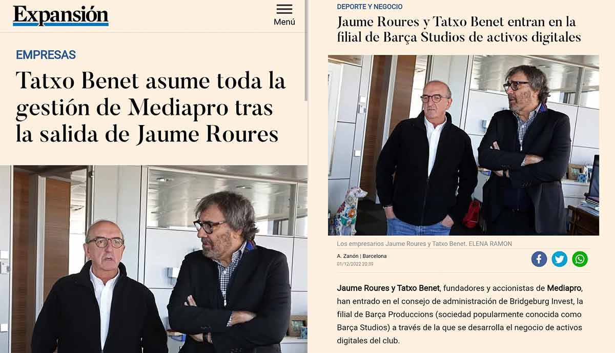 Como publicaba ayer El Español, Tatxo Benet no solo es alto ejecutivo de Mediapro, sino también integrante del Consejo de Administración de Bridgeburg Invest, filial de Barça Studios, ya saben, la empresa que el Barça vende sin solución de continuidad, sin que nadie pague en realidad por ella, de manera cosmética para que Tebas mire para otro lado y la entidad blaugrana pueda seguir inscribiendo jugadores pese a su preocupante situación económica.